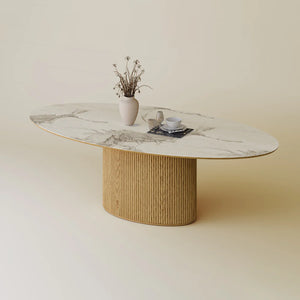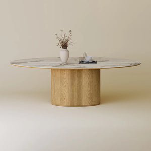 The Marley Dining Table masterfully blends natural elegance with industrial strength, creating a commanding centerpiece for modern dining spaces. The tabletop features a 12mm Chanel marble composite with safely rounded edges, elegantly mounted on an 18mm multi-layer board for superior durability and refined aesthetics. Seamlessly marrying natural wood textures with industrial elements, the Dining Table makes a powerful style statement while offering enduring functionality for memorable gatherings.