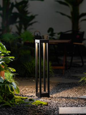 The ShadowPost Slim Outdoor Bollard Floor Lamp is a minimalist bollard fixture defined by clean geometry and vertical presence. Its open-frame aluminum structure creates a sculptural silhouette while allowing light to cast subtle, unobstructed patterns along pathways and landscapes.