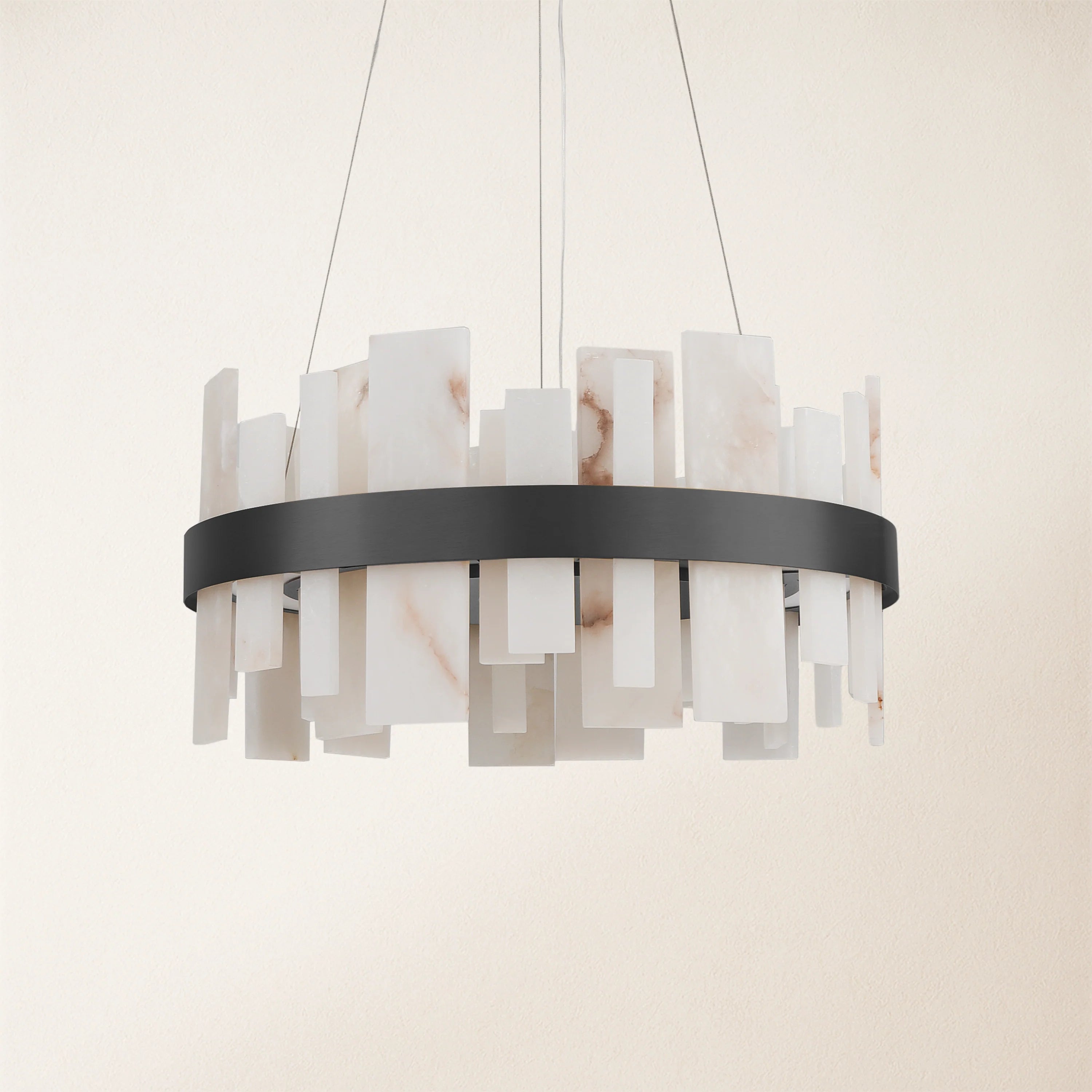 The Nocturne Alabaster Series features a sculptural halo of hand-cut Spanish alabaster panels, gently diffusing a soft, ambient glow. Its minimalist profile and warm luminosity make it ideal for dining rooms, living areas, or entryways, while the naturally veined stone ensures every fixture is uniquely beautiful. Designed for adjustable suspension and sloped-ceiling compatibility, it suits both modern and classic interiors.