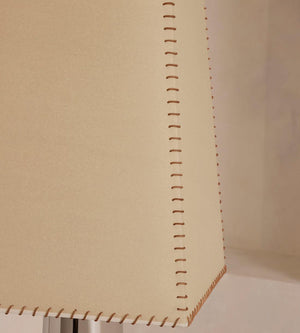 A fluted base in mirrored chrome is subtly complemented by a tapered parchment shade.
