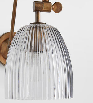 The Benny wall light has a vintage feel that references the styles at Soho Warehouse, LA. The extendable wall light has a ribbed glass shade, which works well with an incandescent bulb. It's designed with versatile antique brass finish arms that move to suit your lighting needs. Fit it by your bedside to create directional light for late-night reading.