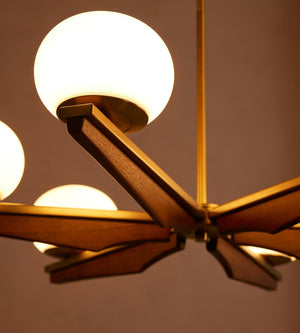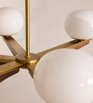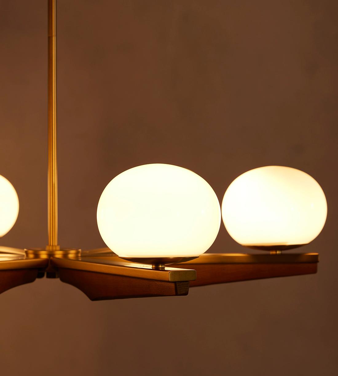 Our Demarco chandelier is designed to hang in the centre of a dining table or living room. Suspended from an antique brass pole, the chandelier features six oval glass orbs that are fixed onto a solid oak and brass frame. Use it to cast a soft, diffused light overhead, and reference the vintage-inspired lighting seen throughout White City House.