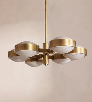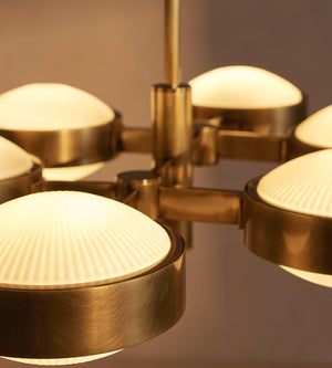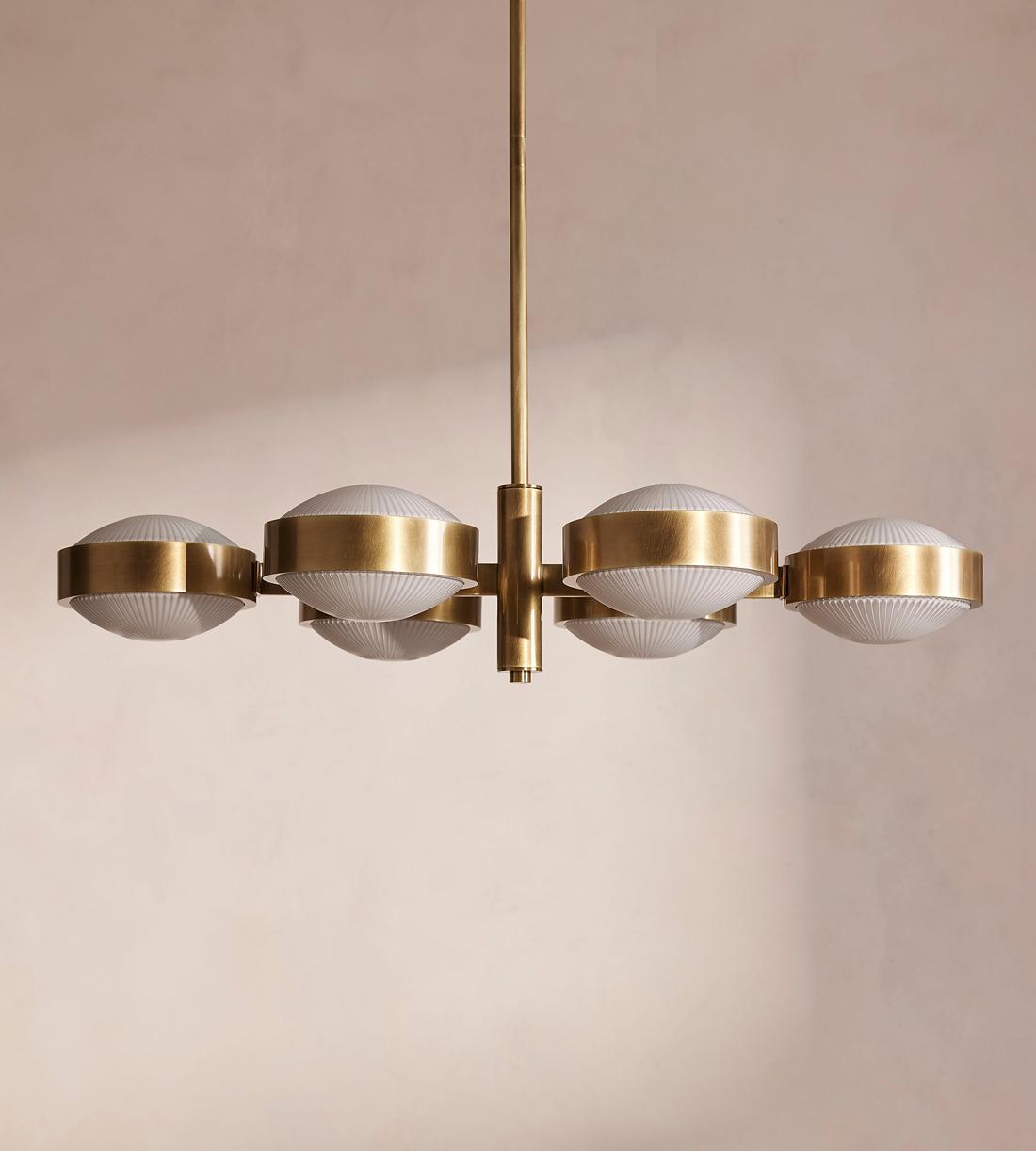 Our Edith pendant chandelier is a vintage style that draws inspiration from the 1970s interiors of White City House. Six moulded and ribbed glass shades sit on an antique brass-finish frame, which when lit give off a warm, milky glow. Hang low over a dining table or above a stairway to bring the area into focus.
