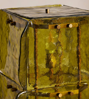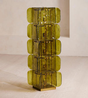 Designed in-house, the Elias floor lamp is made from square blocks of green, molded glass stacked into a column-style silhouette. At the center, a brass-plated framework is treated with an antiqued finish.