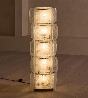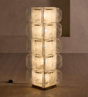 Our Elias floor lamp is made from square blocks of green moulded glass stacked into a column-style silhouette. At the centre, its brass-plated framework is treated with an antiqued finish.