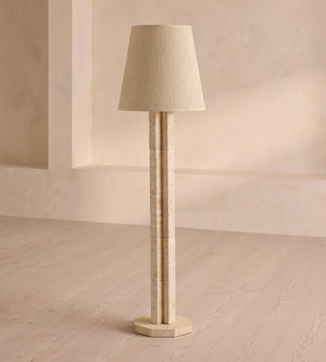 Roughly textured travertine pieces are vertically stacked to form the octagonal stem of our Hawksworth floor lamp. Contrasting stripes on its silk shade mirror the finish of the base, while simultaneously softening the raw travertine edges by creating a warm, ambient light.