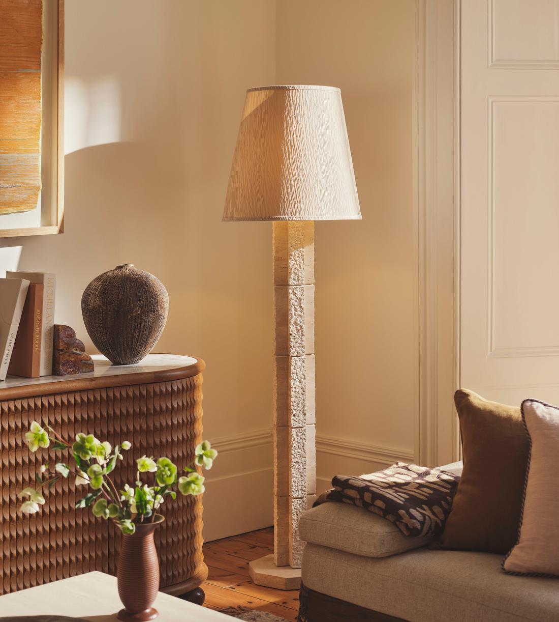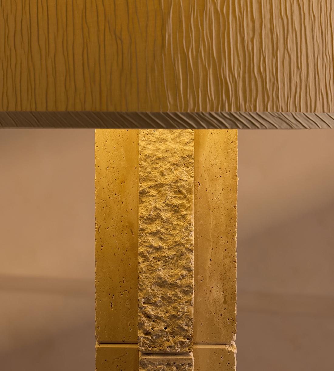 A raw-edged travertine base contrasts against a silk shade that creates a soft, warm light.