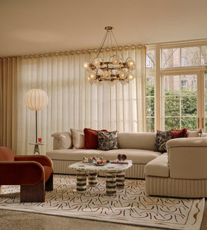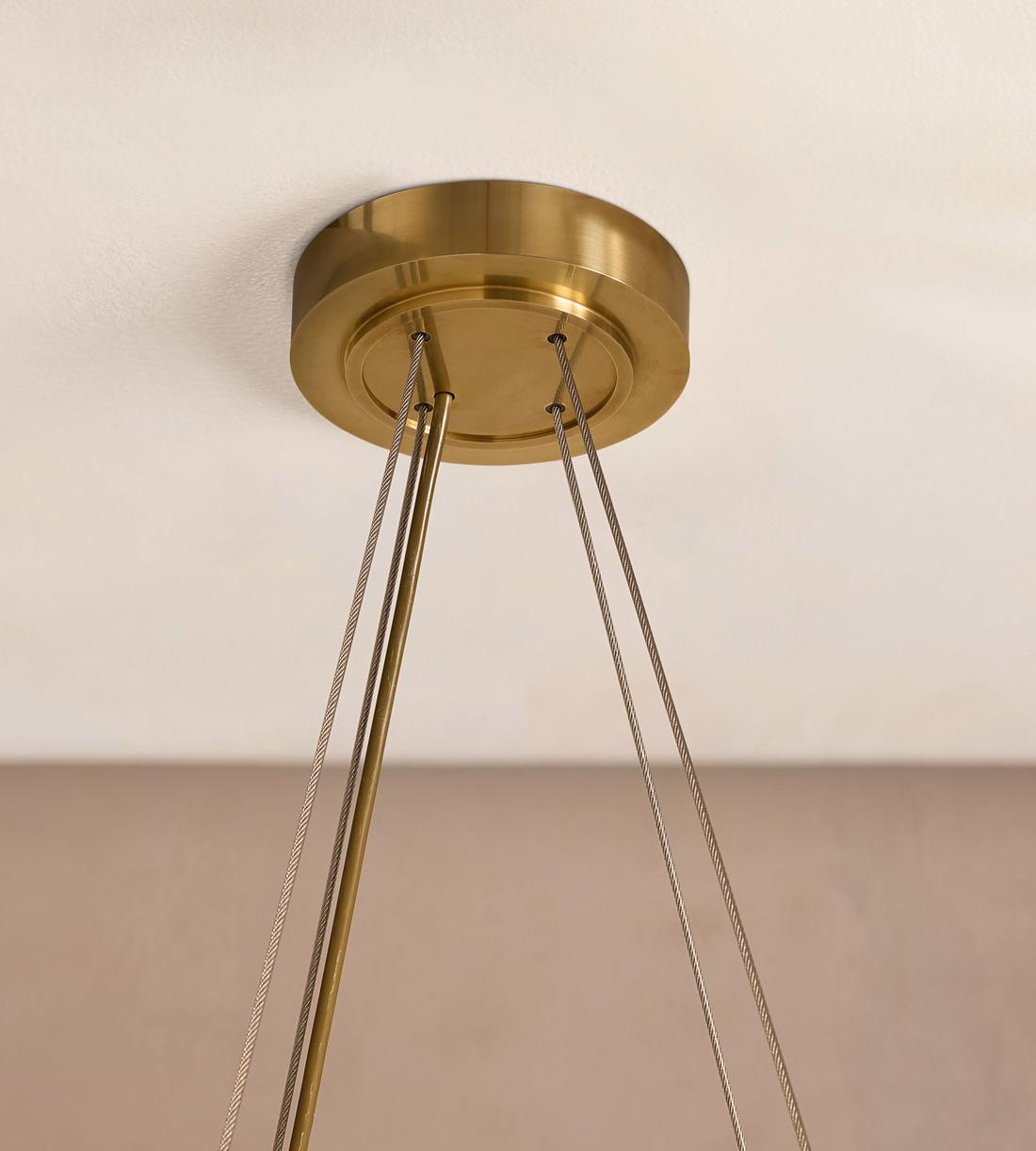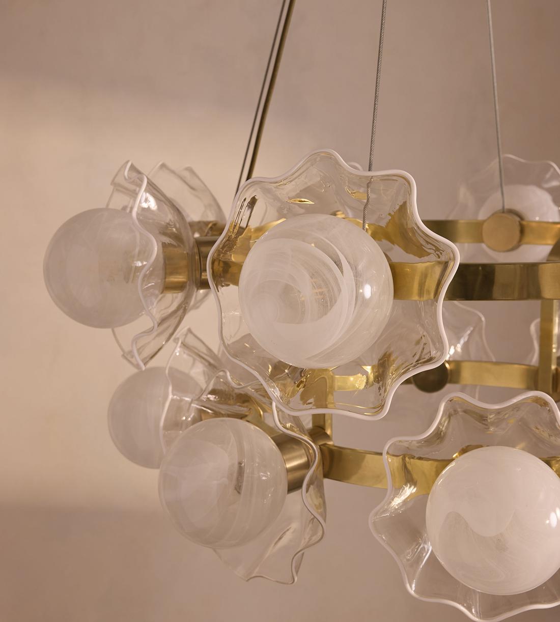 Set on scalloped bases surrounded by contrasting edges, the globe-shaped bulbs of our Holly chandelier are each crafted from white swirl glass. Fitted with a dimmable function, its rounded brass frame is secured by tensile cables.