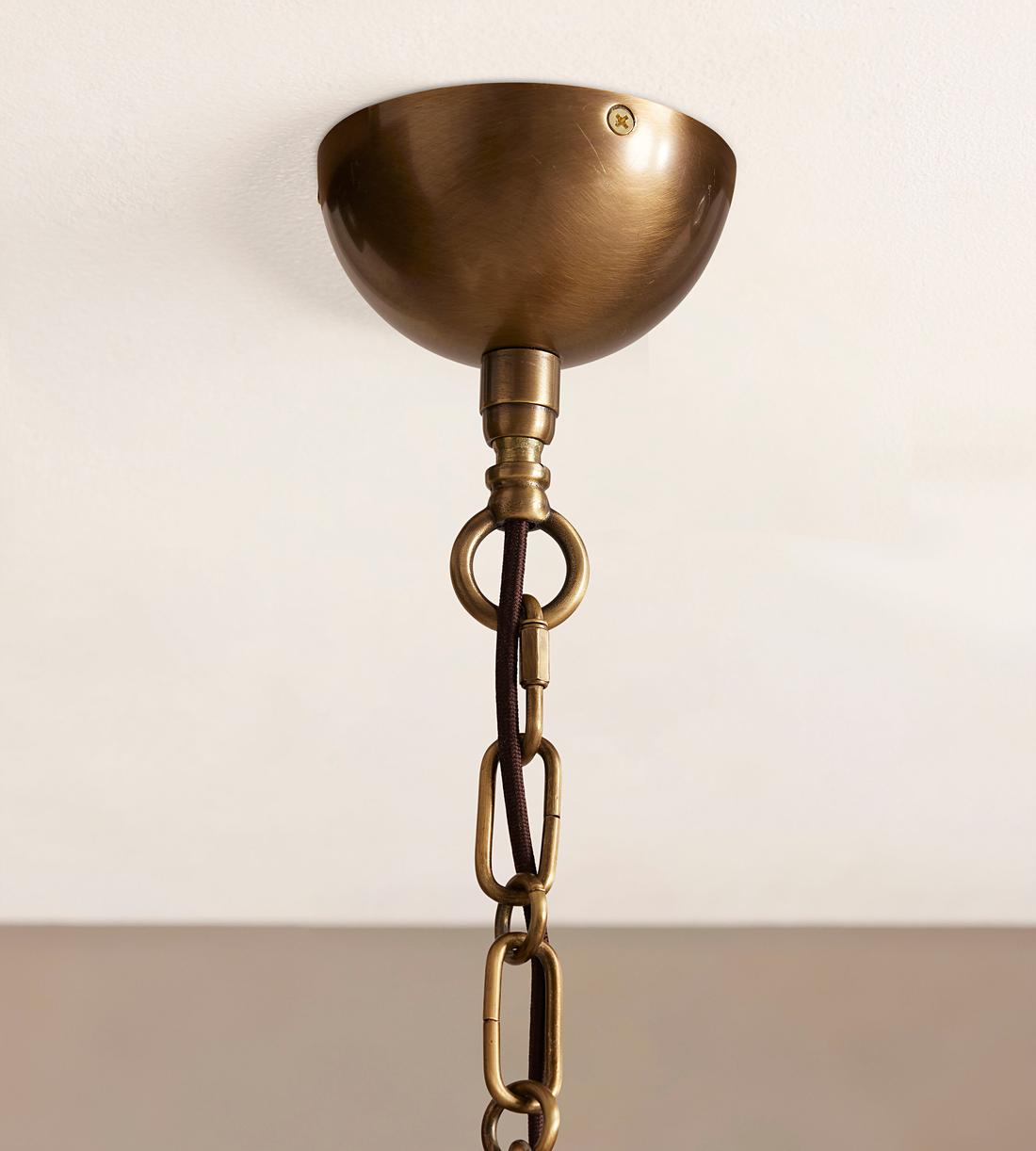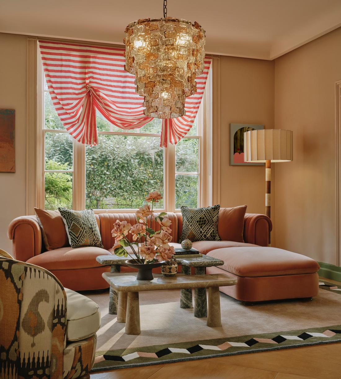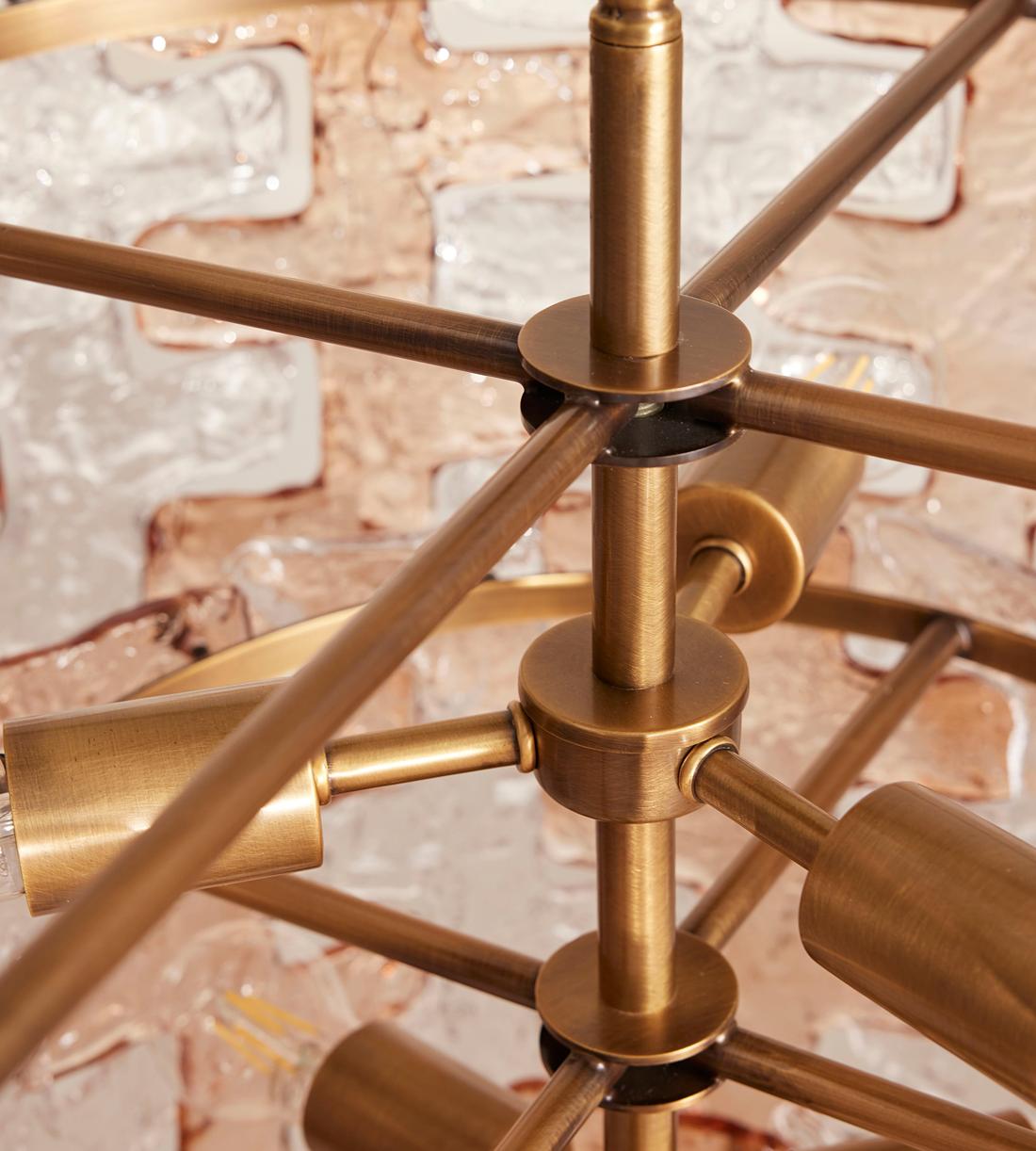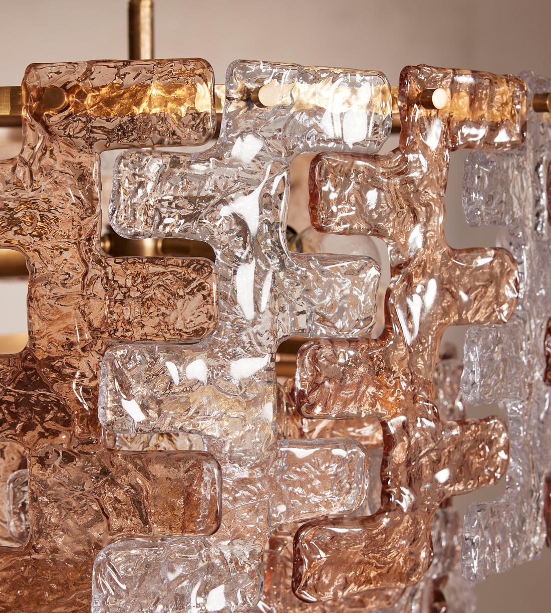 Inspired by the colors seen in Soho House Bangkok, the Iona chandelier is made using alternating pieces of peach and clear glass, each formed in a rippled mold for a highly textural finish.