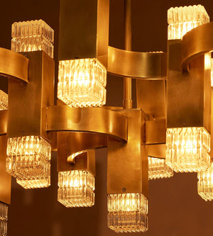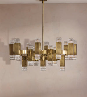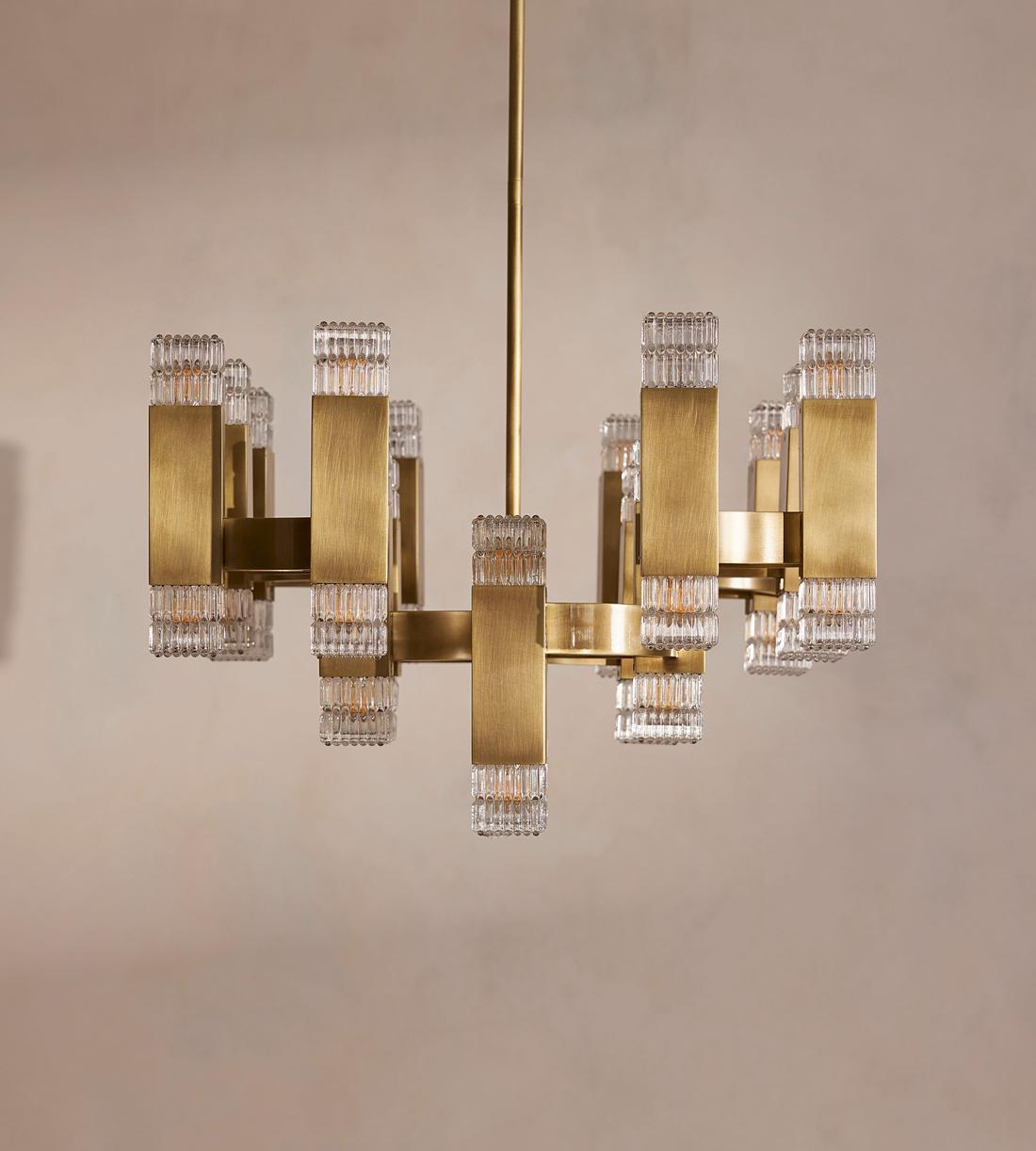 Formed from antiqued brass, the soft, sweeping arms of this chandelier are fitted with faceted glass bulbs for a geometric twist.