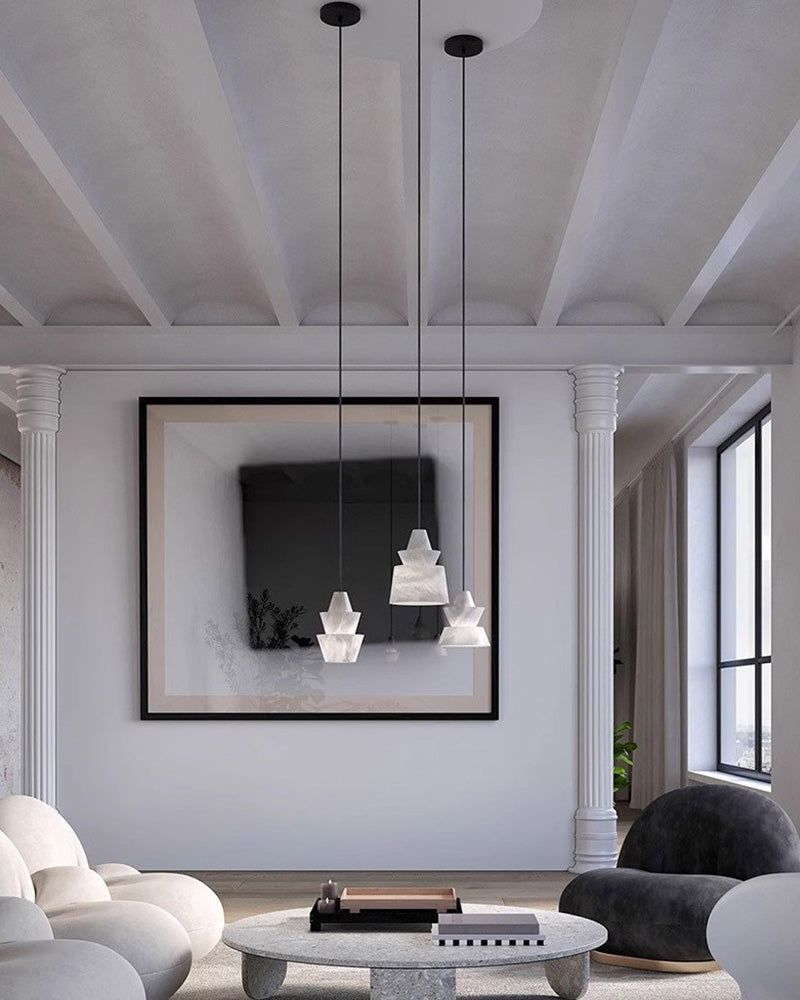 • Sleek, layered cones create a sculptural focal point for contemporary interiors.