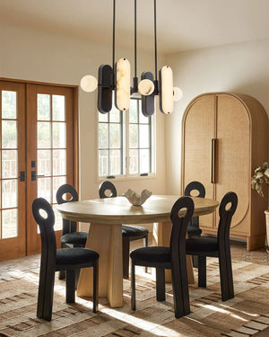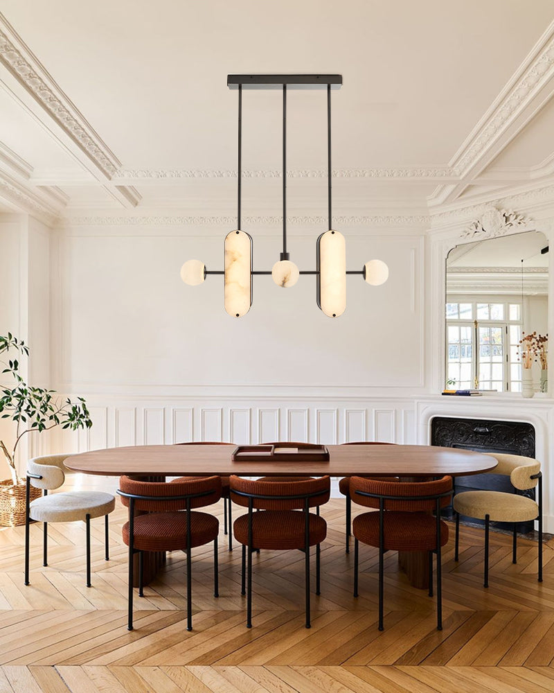 - Clean black lines & smoky-textured alabaster globes create a modern focal point.