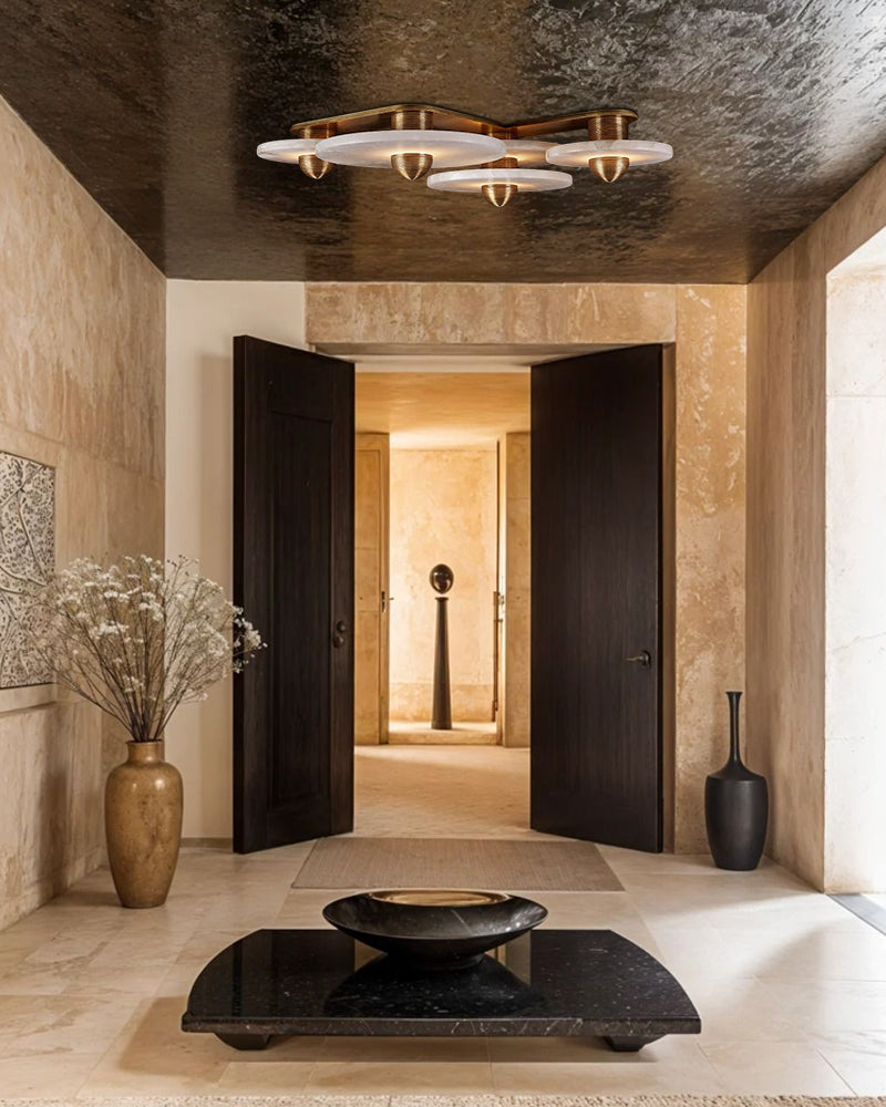 - Natural veined alabaster planes meet polished fluted brass for timeless luxury.