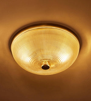 Recreate the lighting scheme of 180 House in your own living space. Our Ottilie Glass flush light sits close to the ceiling in a textured clear glass dome with antique brass details, referencing the vintage-inspired interiors of our London club space.