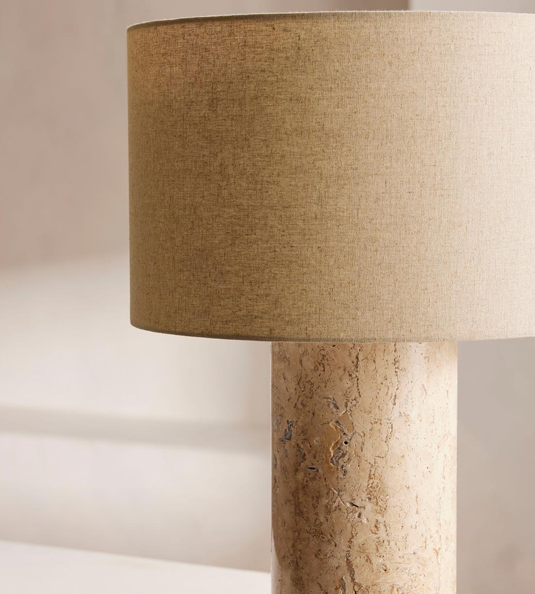 Crafted from solid travertine, which has natural colour variations and inclusions, this lamp is entirely one of a kind. Inspired by the interiors at 180 House on the Strand, it's finished with subtle brass finished detailing and comes with a natural linen shade.