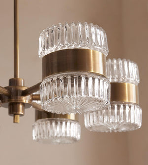 Influenced by the restrained glamour of Gatsby-era American interiors, Renato will make an impact in any space. Six arms in antique brass radiate from a central fixed spine, with faceted glass cylinders casting distinctive light patterns. Look for similar chandeliers in our North American Houses, particularly Brooklyn's DUMBO House.