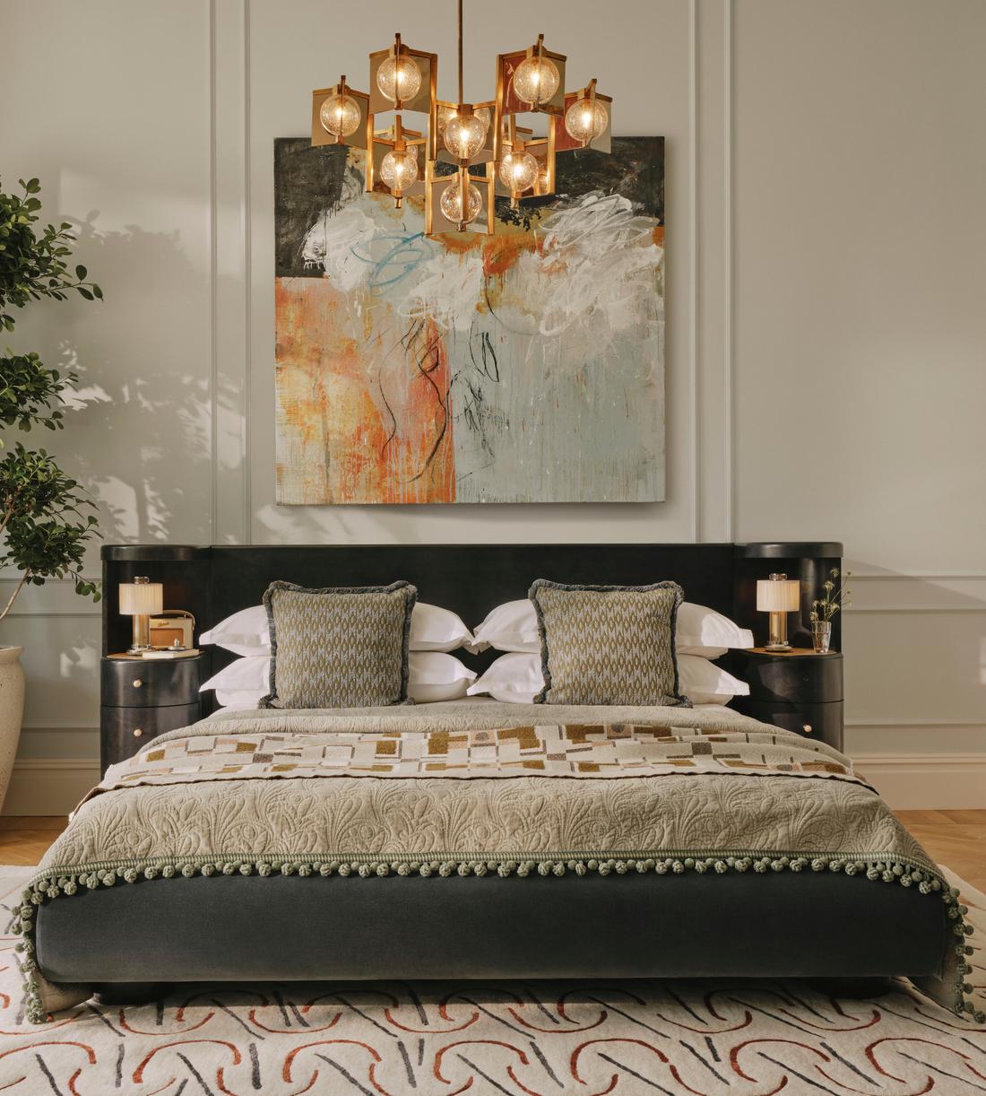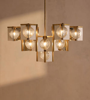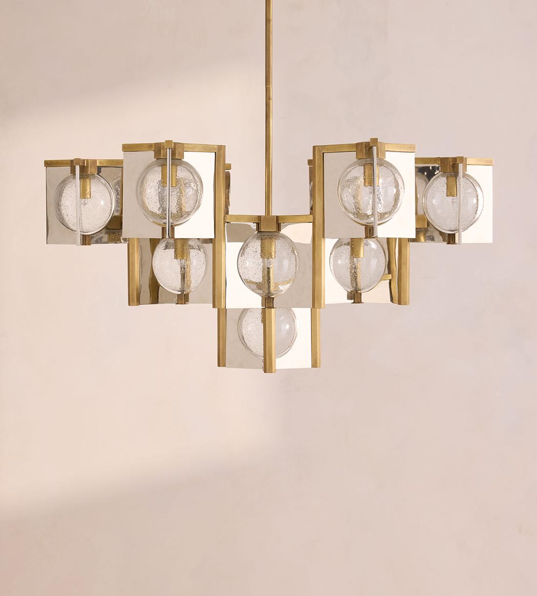Set over three tiers, the geometric form of our nine-light Simone chandelier brings together bubbled glass globes and mirrored chrome structures anchored by a brass frame.