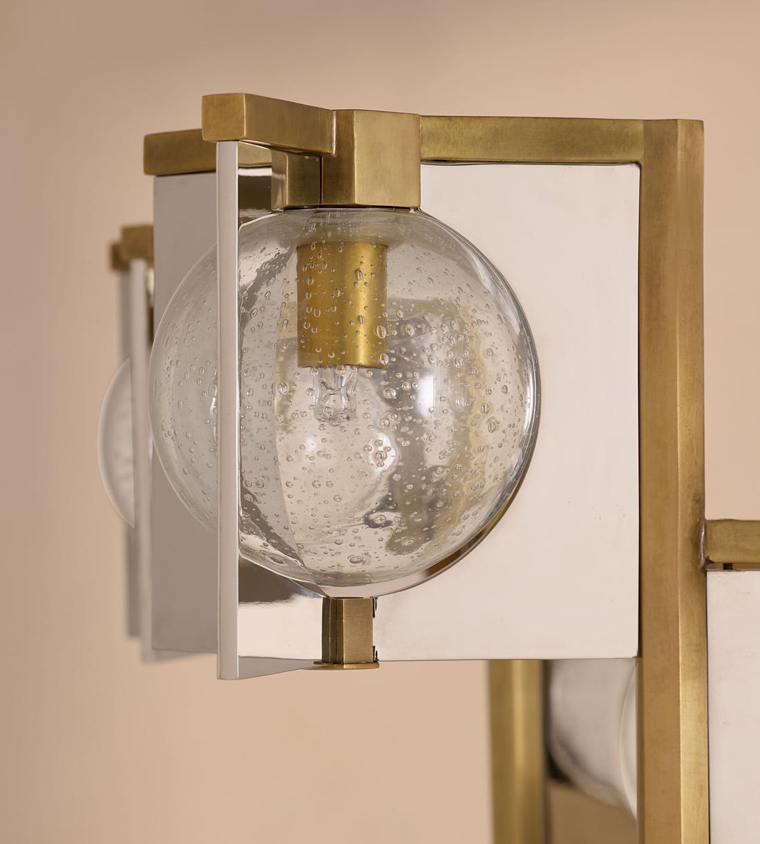 Orb-shaped globes are made from bubbled glass with panels of mirrored chrome to reflect each globe's soft glow.