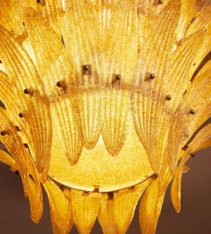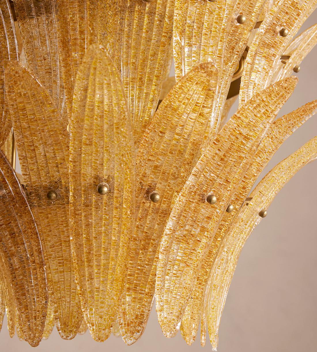 Handmade from pressed sugar glass, the chandelier has a three-tier chevron construction, with amber petal-like segments that open outwards from an antique brass frame.