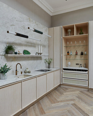 - Polished marble + frosted glass with solid brass/aluminum finishes.