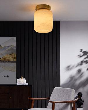 - Sleek semi-flush silhouette blends round alabaster orb + square brass frame.