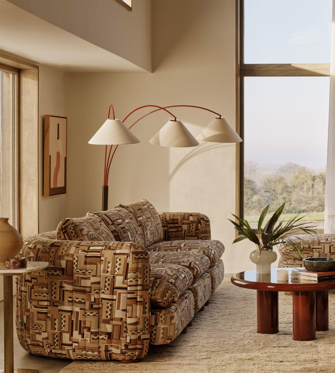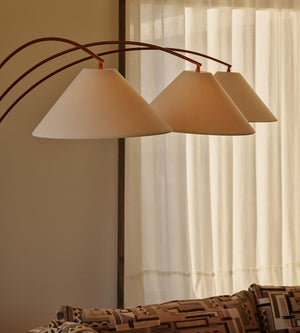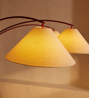 The Parker lamp is designed to be a focal point in any room. Inspired by the 1960s interiors of White City House, a multi-head arched frame has been given a red lacquered finish for a touch of colour, with three diffused cream linen lampshades that can be removed for a brighter light setting. Adjustable arms allow this light to adapt to your living space, anchored by a honed Rosso Levanto marble base.