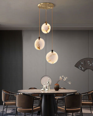 • Modern Geometric Design: Round dual-alabaster discs with antique brass tubing.