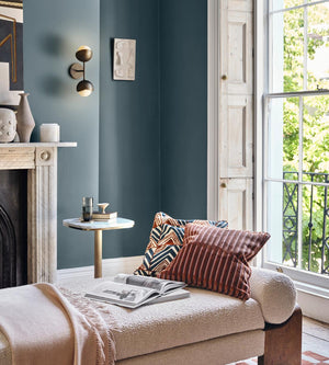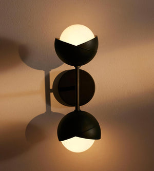 Comprising two bisected orbs in blackened brass plating, the wall sconce serves as a versatile lighting option that is suited to both narrow hallways and expansive living areas.