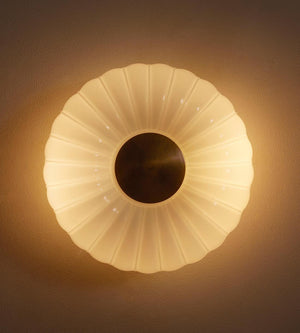 Reeded detailing radiates out from a central brass disc to give this light's domed shade a scalloped edge.