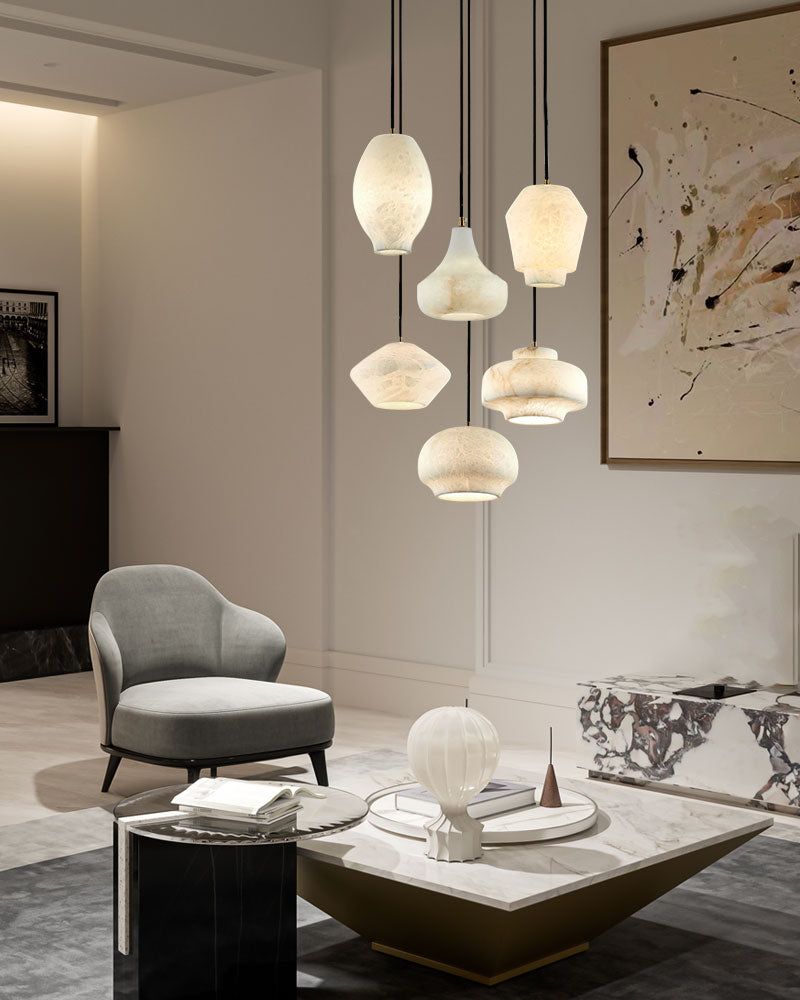 - Natural Alabaster Shade-Translucent marble with soft, unique veining for warm ambient light.
