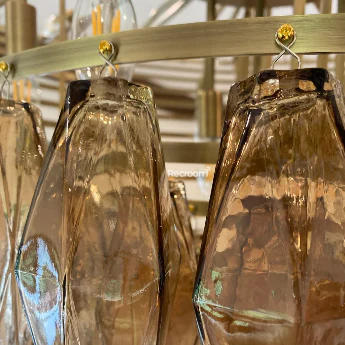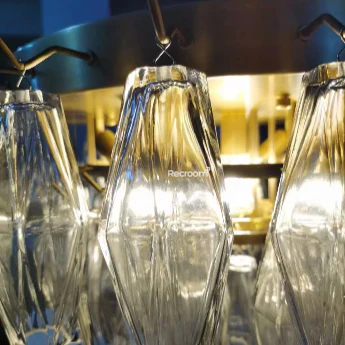 Our Chia Collection celebrates the period's minimalist spirit in a grand manner. Radiating from a tiered steel frame, dozens of handblown glass polyhedrons hang from individual hooks. Lit from within, the faceted pendants dramatically reflect and refract the light.