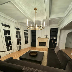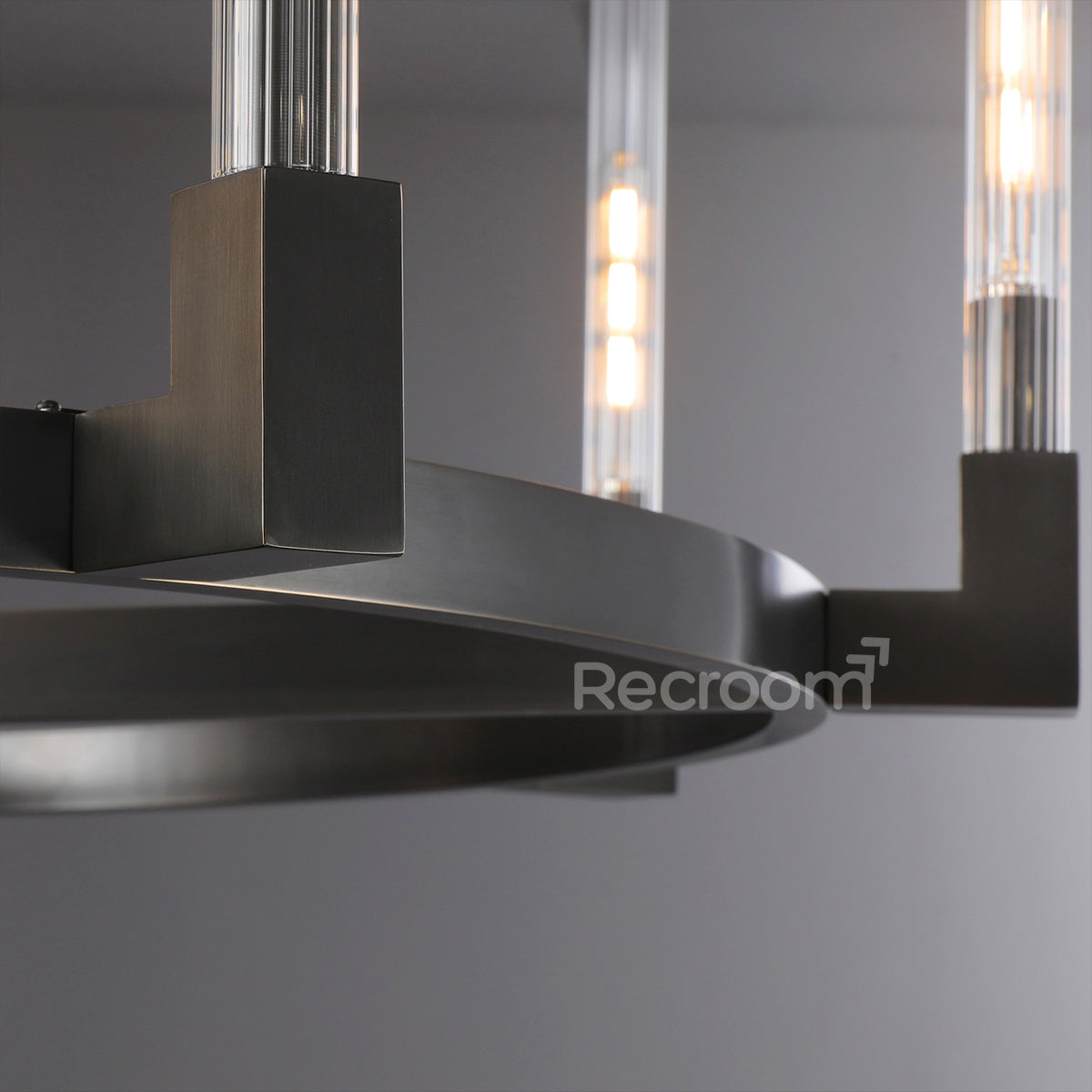 The Cannel Collection reinterprets the form of an aesthetic art chandelier in solid brass. The fixture's clean, angular lines and elegant prismatic glass hurricanes display Edison filament bulbs as if they were flickering candles.