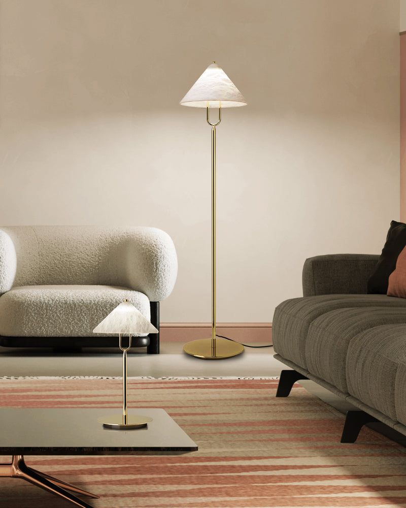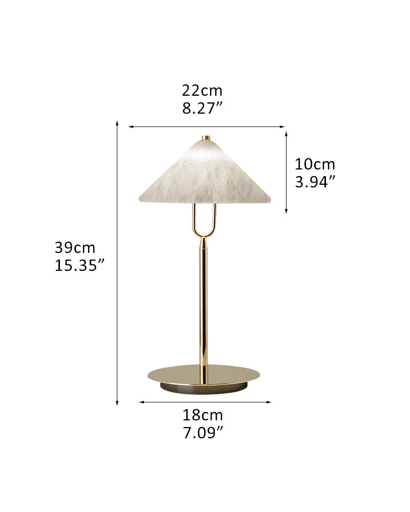 - Sleek Cone Shade with Handcrafted natural alabaster stone diffuses soft in LED glow.