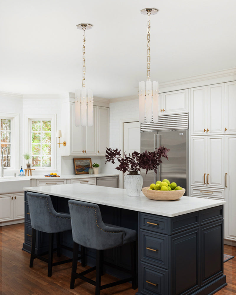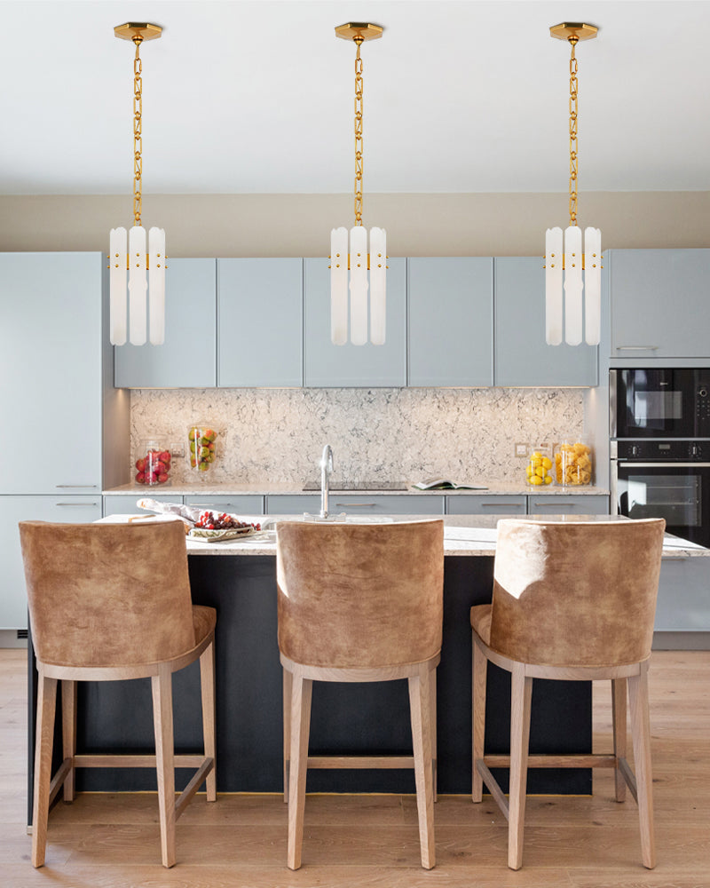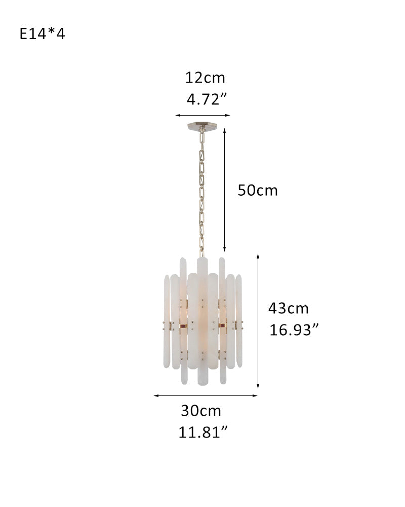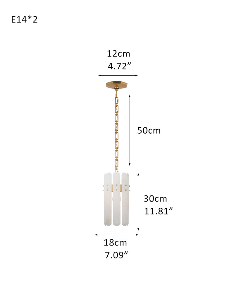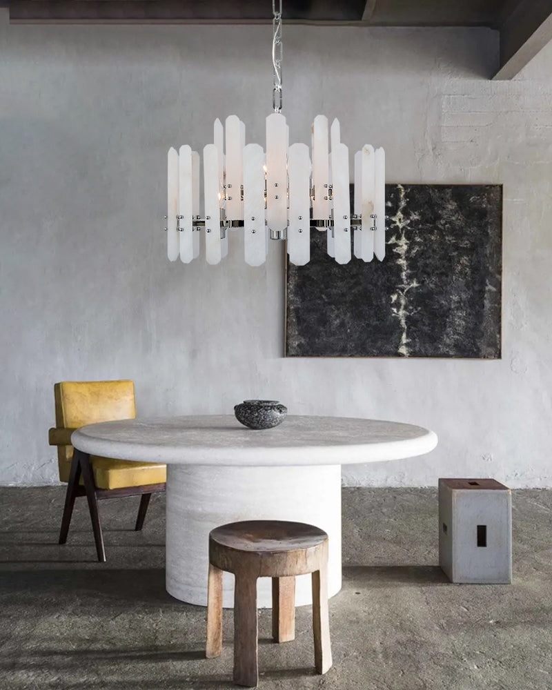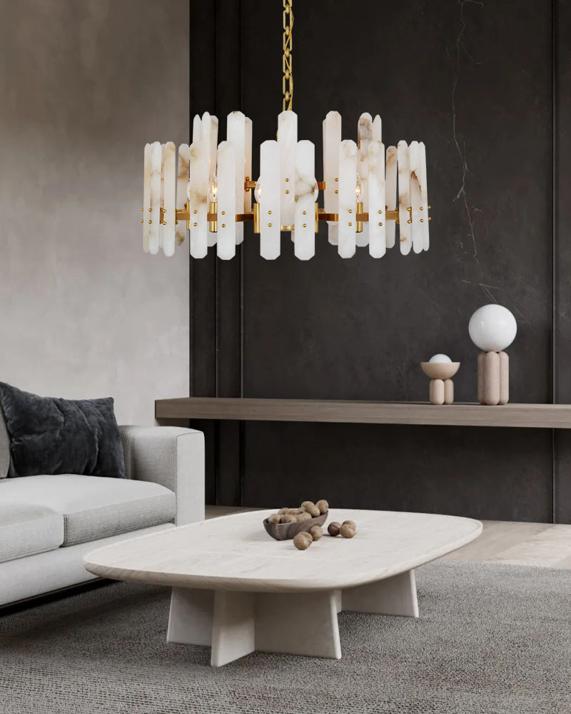 • Durable alabaster diffuses light; brushed metal adds refined contrast.