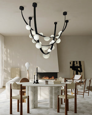 - Material fusion: Leather + marble shades on U-shaped metal base.