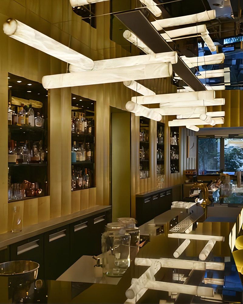 • Alabaster & Copper: Warm metallic accents contrast luminous natural stone texture.