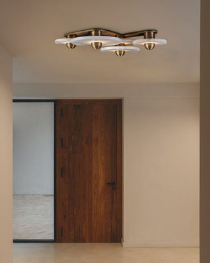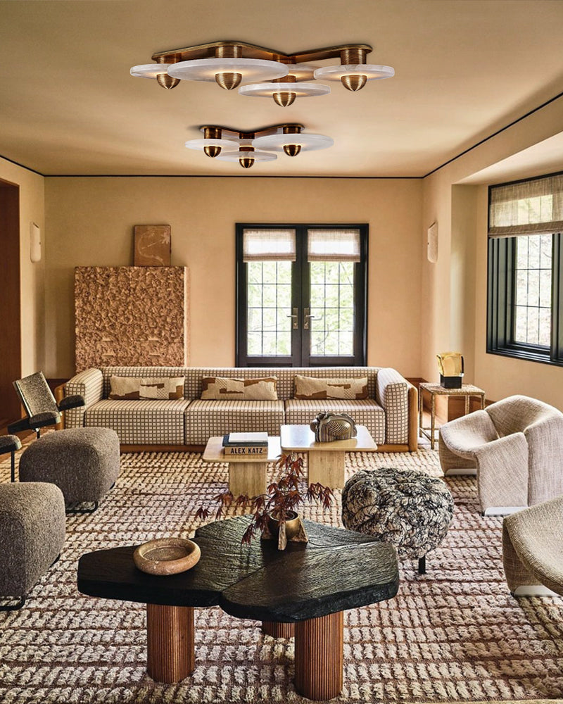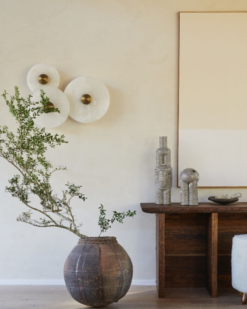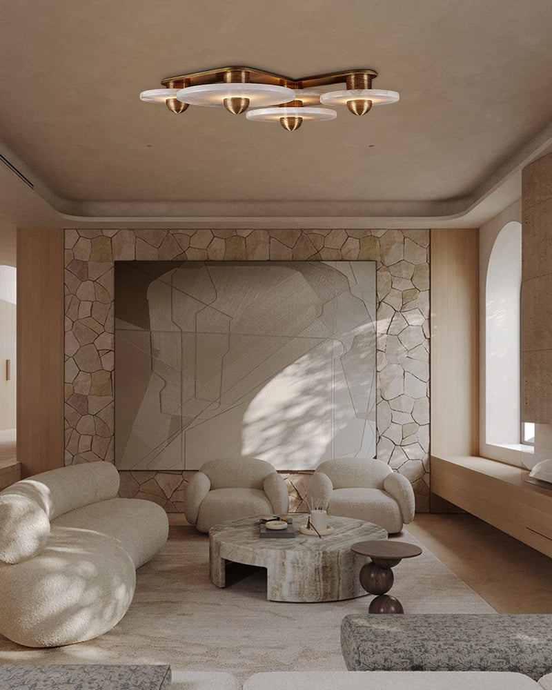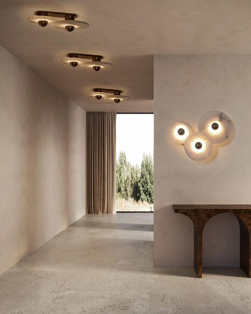 - Natural veined alabaster planes meet polished fluted brass for timeless luxury.