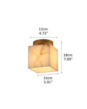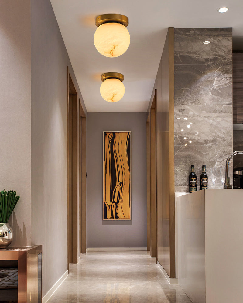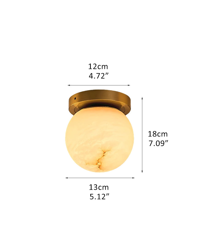 - Sleek semi-flush silhouette blends round alabaster orb + square brass frame.