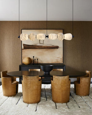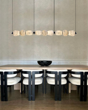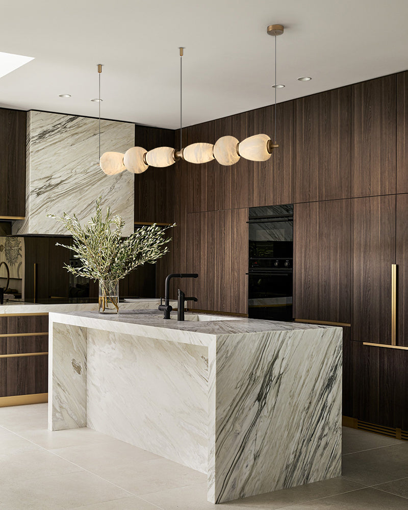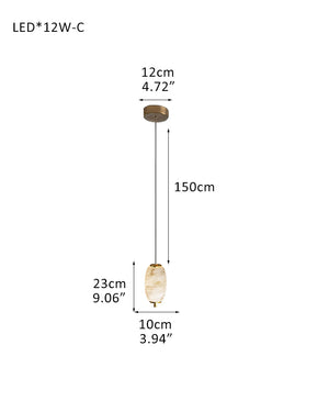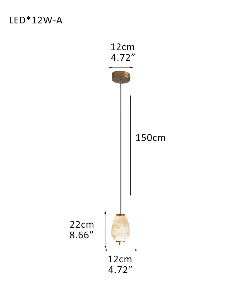 - Hand-carved alabaster shade drapes over sleek LED lighting.