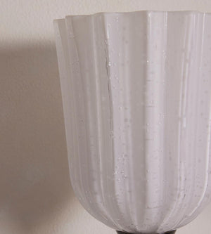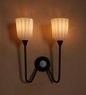 Extending from a double arm carved from black brass, the two molded, tulip-style shades on our Quaid wall light are made from bubble frosted glass. This style is designed to mirror the French-inspired interiors of High Road House.