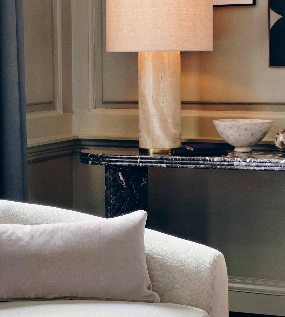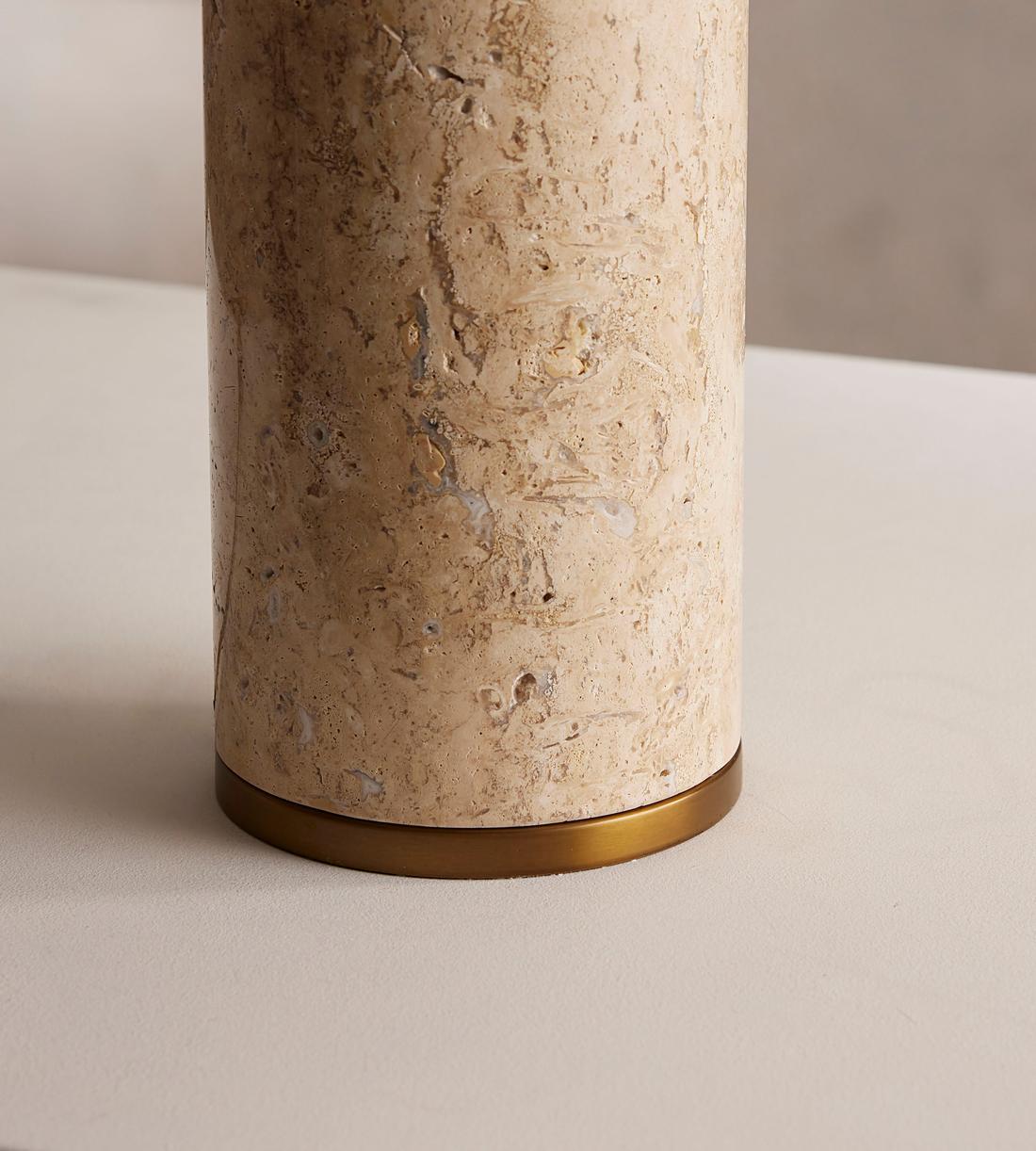 Crafted from solid travertine, which has natural colour variations and inclusions, this lamp is entirely one of a kind. Inspired by the interiors at 180 House on the Strand, it's finished with subtle brass finished detailing and comes with a natural linen shade.