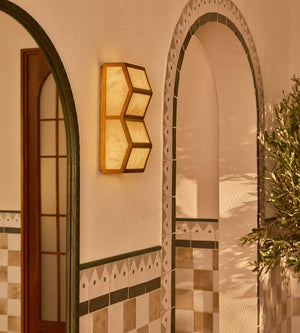 Secured by a backplate that sits flush against the wall, the Sebsastian wall light is softened by alabaster panels and features a brass frame, which creates an angular side profile.