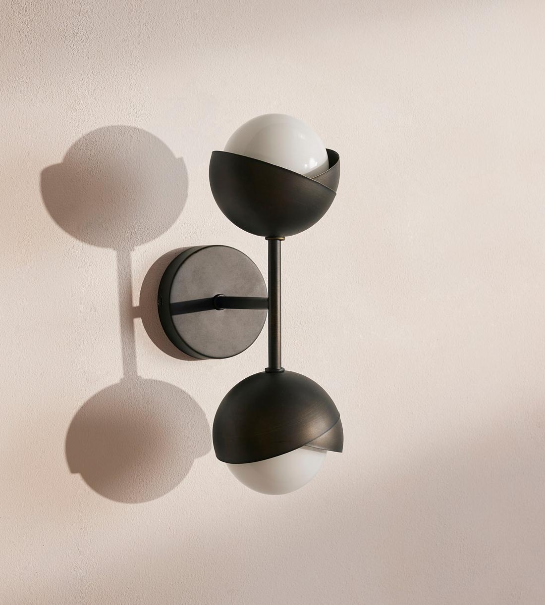 Comprising two bisected orbs in blackened brass plating, the wall sconce serves as a versatile lighting option that is suited to both narrow hallways and expansive living areas.
