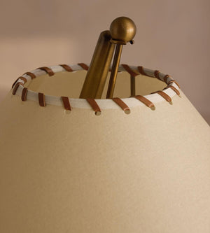 An angled, tapered parchment shade detailing with a leather lace trim complements a slanted oak base.