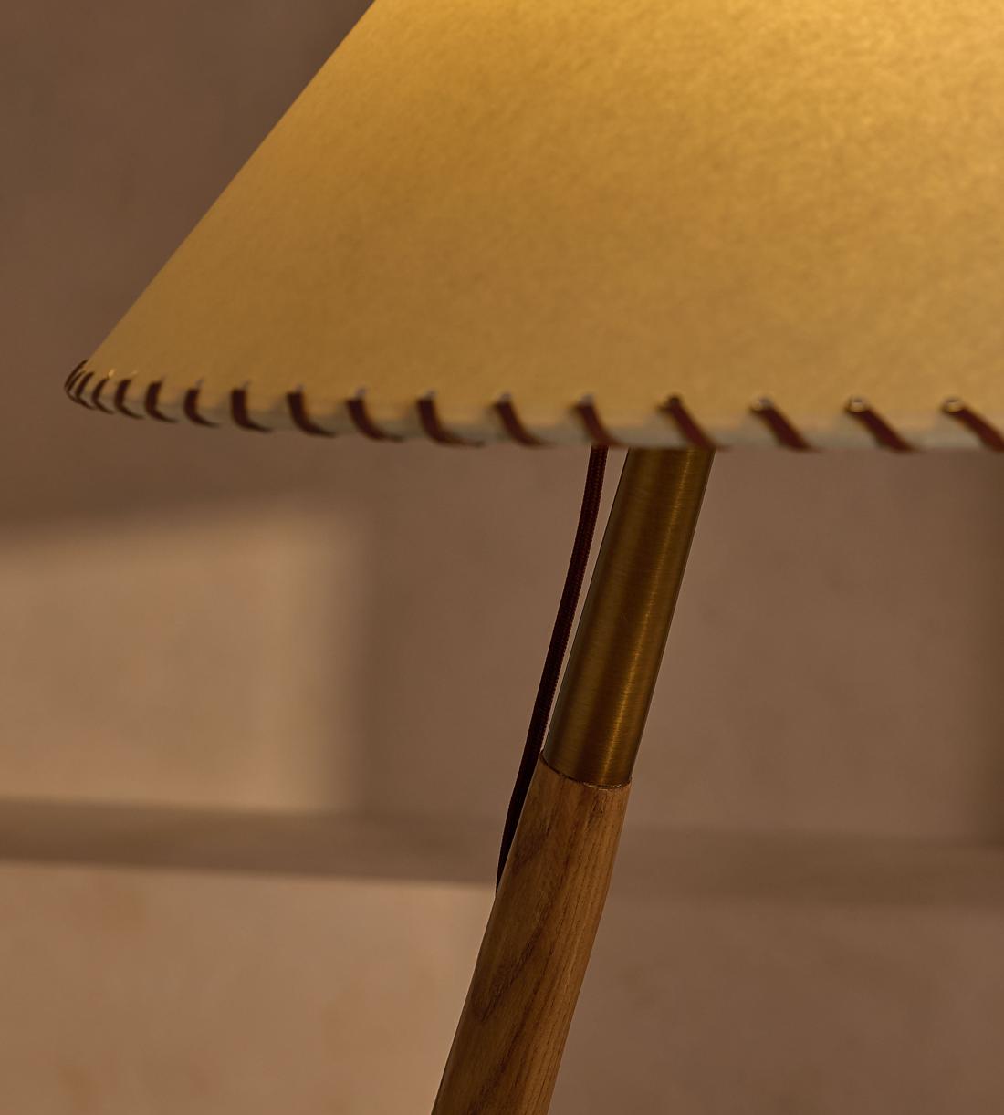 Stabilized by a circular cast iron base, the angular stem of our Wren floor lamp is carved from solid oak. At the top, a tapered shade is crafted from light-colored parchment to let a soft, warm light shine through, and is finished with a contrasting leather lace trim.